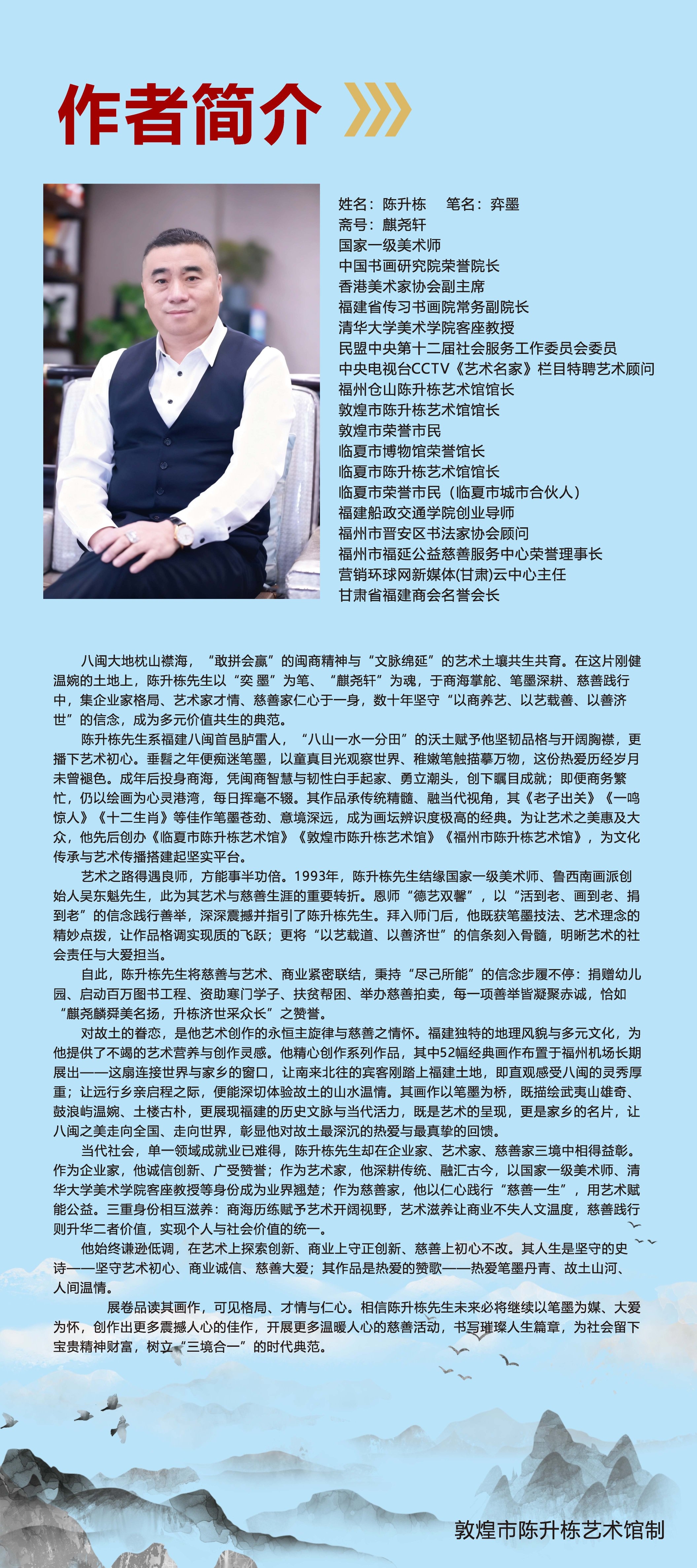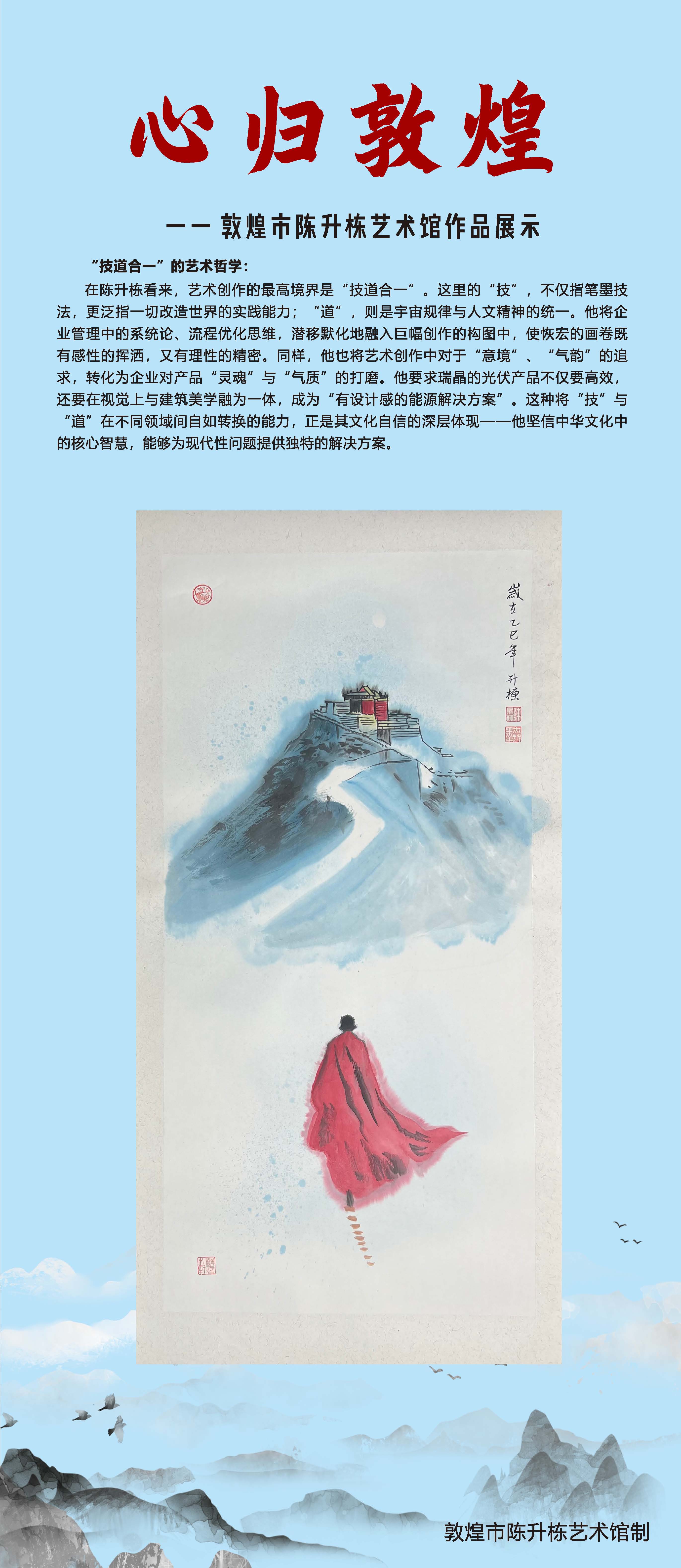 画作以敦煌文化为核心灵感,将丝路古道的雄浑、梵宫古刹的幽静与千年壁画的神韵精妙融合。“红氅迎风向古丘,云中路引梵宫幽”,画中红衣行者迎风伫立,古道蜿蜒穿梭于苍茫丘壑间,云雾缭绕中梵宫隐约可见,笔墨浓淡相宜,既勾勒出大漠的辽阔苍茫,又传递出宗教文化的空灵悠远;“千年壁画今如诉,直把心魂寄绿洲”,陈升栋先生以细腻笔触复刻敦煌壁画的千年风华,线条流转间似有历史回响,将对传统文化的敬畏、对丝路文明的尊崇,以及对生命绿洲的向往,尽数倾注于笔墨之中,让观者在欣赏艺术之美的同时,感受文化传承的磅礴力量。