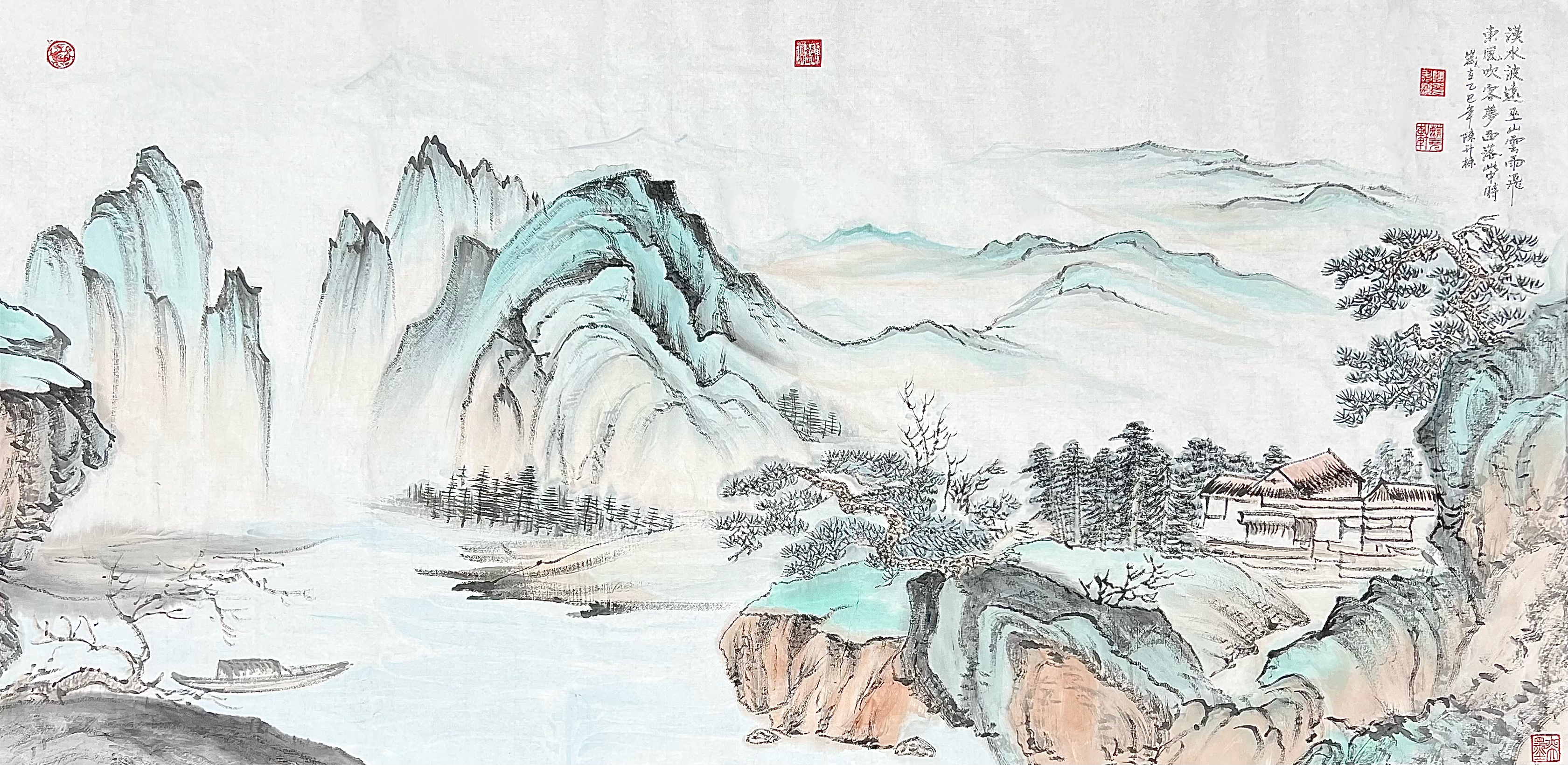 “淡烟笼岫水拖蓝,一棹闲横古渡南”,陈升栋以题画诗为骨,用细腻笔触勾勒出溪山的朦胧之美。画卷之上,淡烟如轻纱般笼罩着层叠峰峦,墨色的浓淡晕染间,远山若隐若现,尽显空灵悠远之态;澄澈溪水如蓝绸蜿蜒流淌,波光粼粼映照着天光云影,古渡南岸,一叶扁舟悠然横卧,无人摆渡却自含闲逸,于动静之间勾勒出远离尘嚣的静谧氛围。艺术家以娴熟的皴擦点染之法,将山石的肌理、水波的灵动刻画得入木三分,北派山水的雄浑与南派山水的秀雅在此相融,营造出“可居可游”的山水意境。