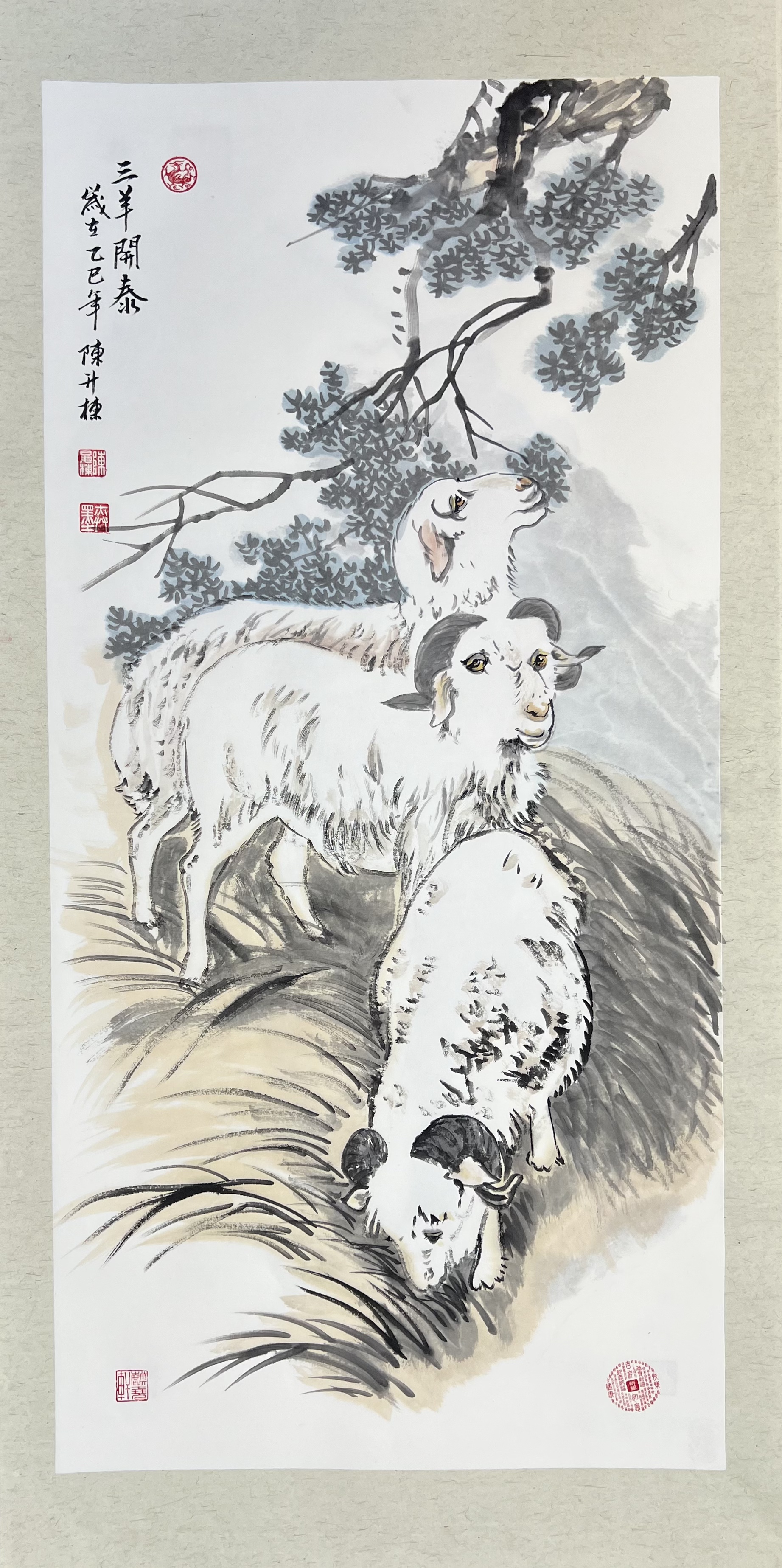 陈升栋以他对艺术的热爱和执着,用手中的画笔,将传统文化中的祥瑞元素与国画艺术完美融合。这幅《三羊开泰图》不仅仅是一幅画作,更是一种情感的寄托,一种对美好生活的向往与祈愿。它跨越了时空的界限,将画家的情感与观者的心灵紧紧相连。