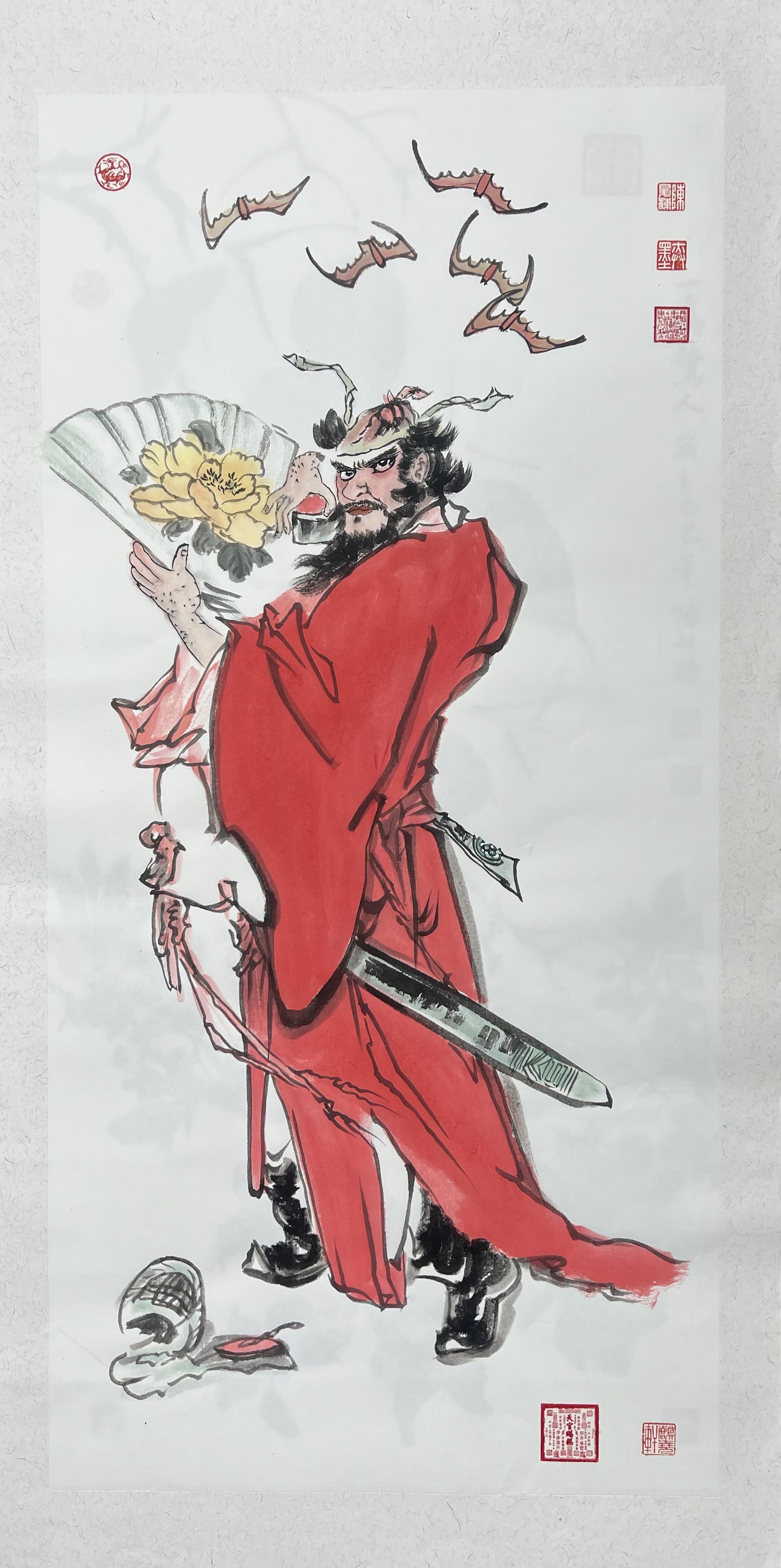 《钟馗威武图》无疑是三幅作品中的又一力作。画面中的钟馗形象威严庄重,目光如炬,仿佛能洞察世间一切邪恶。陈升栋以豪放洒脱的笔触,描绘出钟馗魁梧的身材和飘逸的服饰,线条刚劲有力,犹如刀刻斧凿,彰显出钟馗的勇猛和无畏。钟馗手中的宝剑寒光闪闪,仿佛随时准备斩妖除魔。画面背景渲染出一种神秘而阴森的氛围,更加衬托出钟馗的威武形象,让人感受到正义的力量不可侵犯。