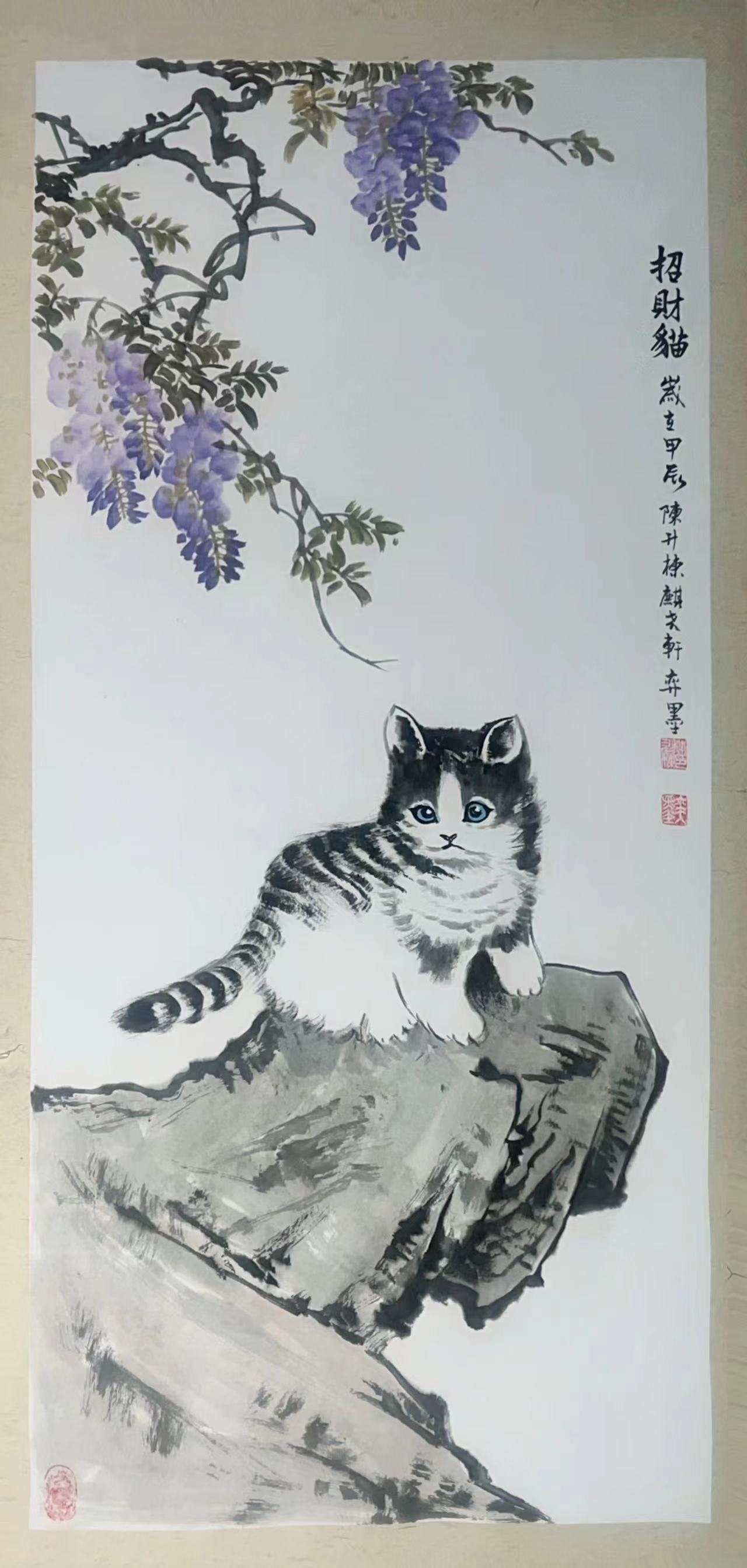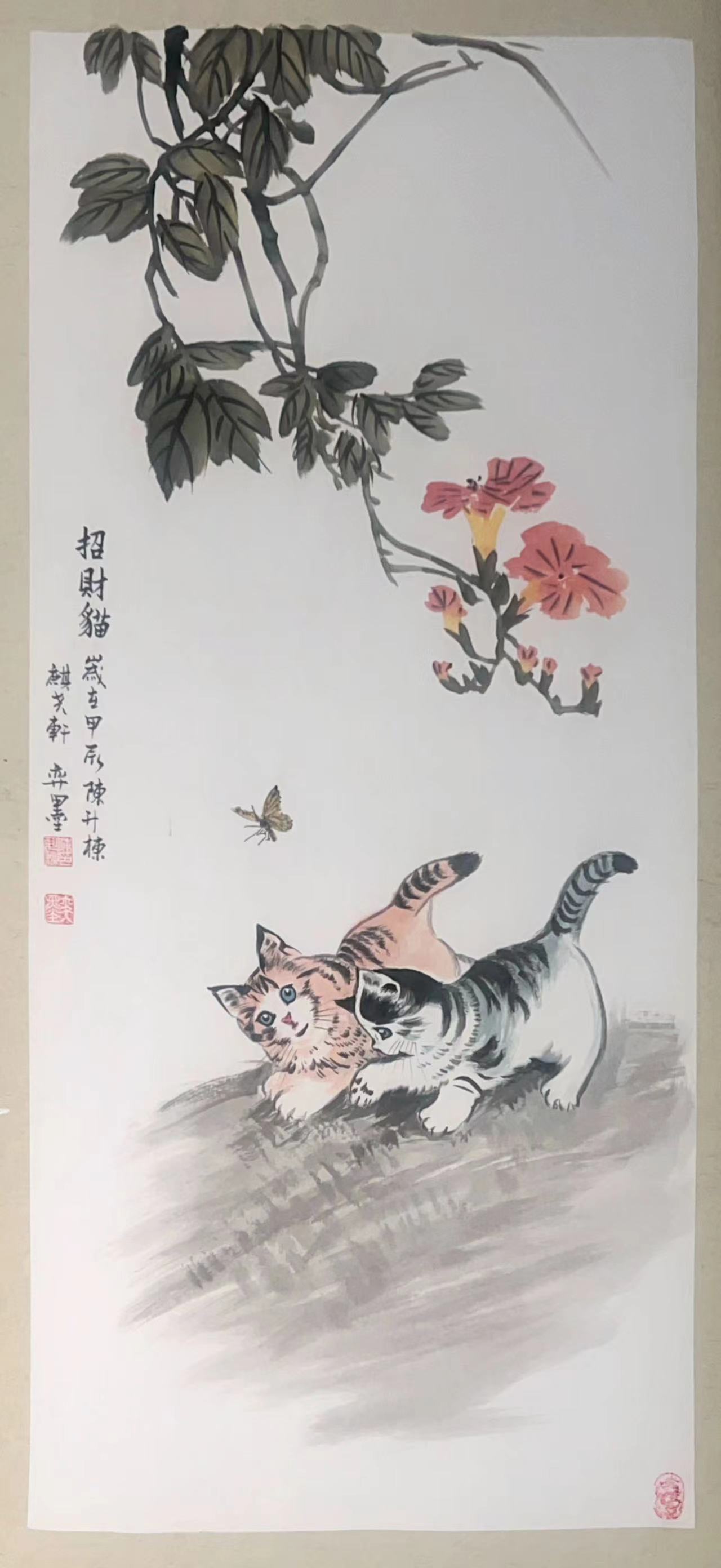 这九幅招财猫国画作品,不仅是艺术创作上的巅峰之作,更承载着深厚的文化内涵与美好寓意。招财猫作为传统吉祥文化的象征,代表着人们对幸福、财富与好运的向往。陈升栋通过国画这一独特艺术形式,将这份美好愿景以更加艺术化、高雅化的方式呈现,让传统民俗文化在水墨丹青中焕发出新的光彩。