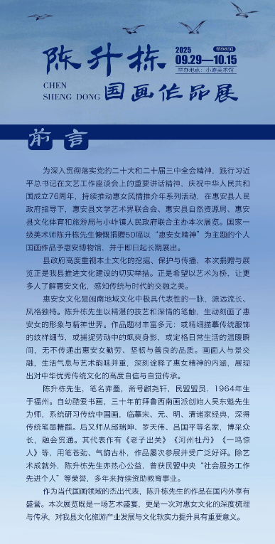 此次“陈升栋国画作品展”的举办,既是惠安文化事业发展的一次重要实践,也为地域文化交流搭建了桥梁。未来,惠安将继续依托丰富的文化资源,举办更多高品质的艺术活动,推动文化与旅游深度融合,助力地方文化软实力提升。