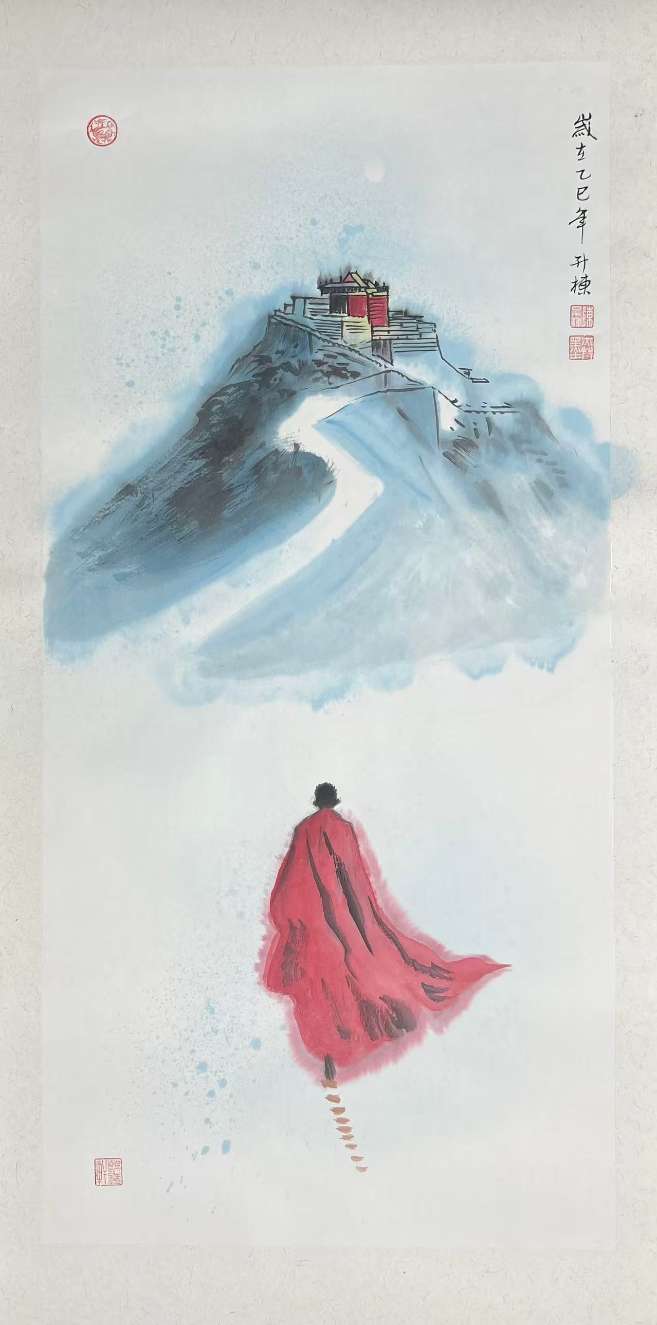 那袭红衣僧人,是画里跃动的魂:红氅如焰,卷裹着高原的罡风,却于笔锋的皴染里透出沉静的力量,似将天地间的虔诚都织进了衣袂的褶皱;步履所向,是云雾如苔般覆着的天路,那蜿蜒的白,既是高原的肌理,更是心向圣境的轨迹,在水墨的晕染里,晕出“路远情长”的苍茫与壮阔。