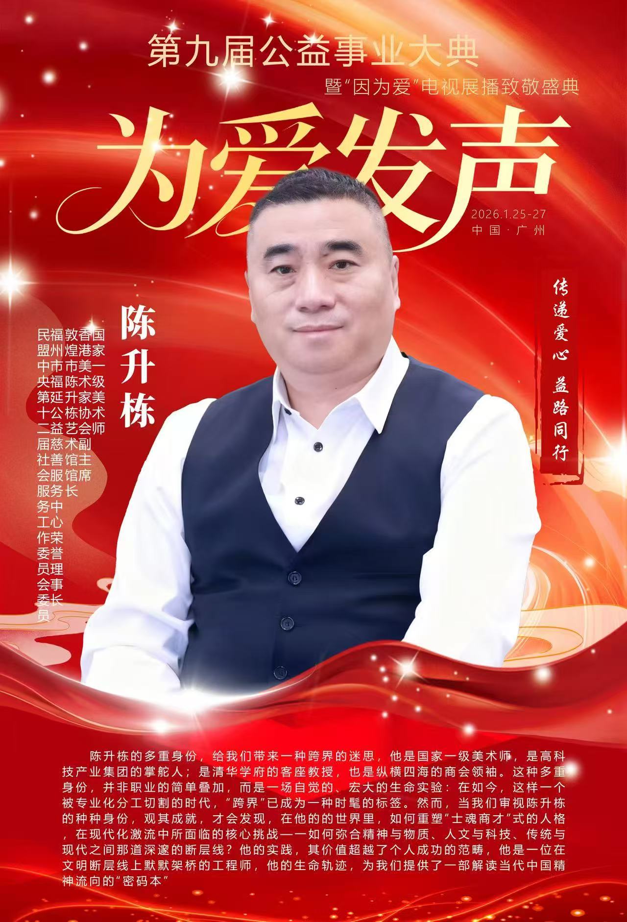 营销环球网讯“绘画是心灵静土,经商是立身之本,慈善是本心所向。”这是国家一级美术师、陈升栋艺术馆馆长、福建晖翔投资有限公司董事长陈升栋在访谈中对自己人生的凝练概括。这位深耕甘肃投资领域二十余载、如今回归福州胪雷故土的闽籍企业家,以跨界之姿在艺术、商业与公益的天地间从容行走,用笔墨传递文化温度,用行动诠释社会责任。
