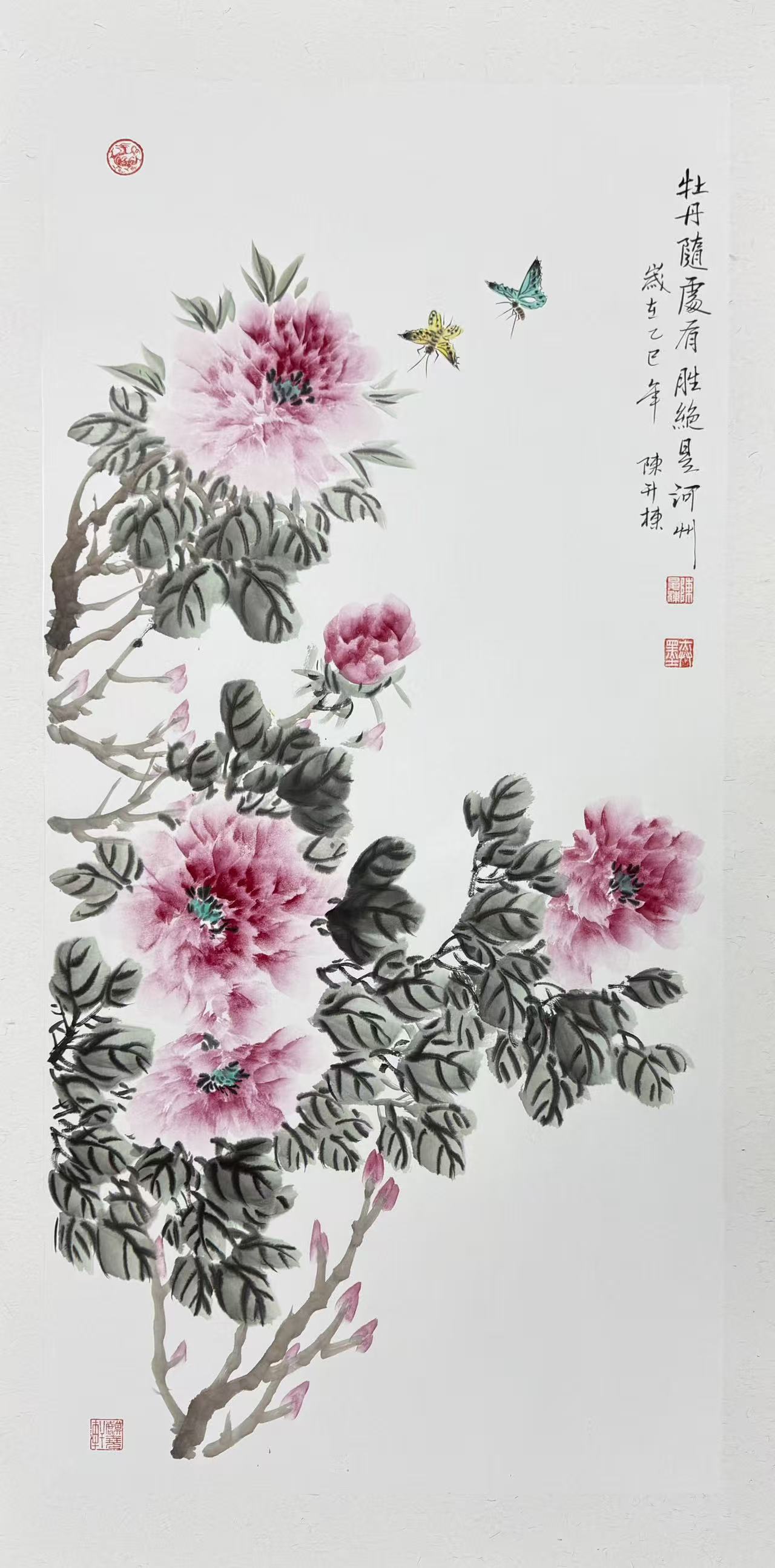 画中蝶舞溪畔的景致,更是灵韵尽显的点睛之笔。陈升栋先生以灵动婉转的线条勾勒蝶影,翅脉轻舒、身姿翩跹,双蝶逐香振翅,掠过澄澈翠溪、绕花而飞,恰合“双蝶蹁跹过翠溪”的生动画面。蝴蝶的轻盈灵动与牡丹的雍容静美相映成趣,潺潺溪影与灼灼花光相融相生,一动一静之间,让整幅画面焕发出鲜活的春日生命力,观之如临其境,宛若步入芳菲满径的溪畔春境,馥郁扑面。