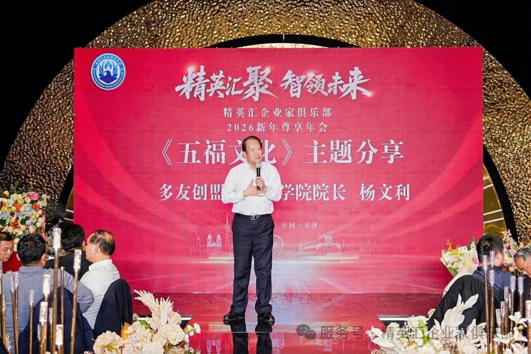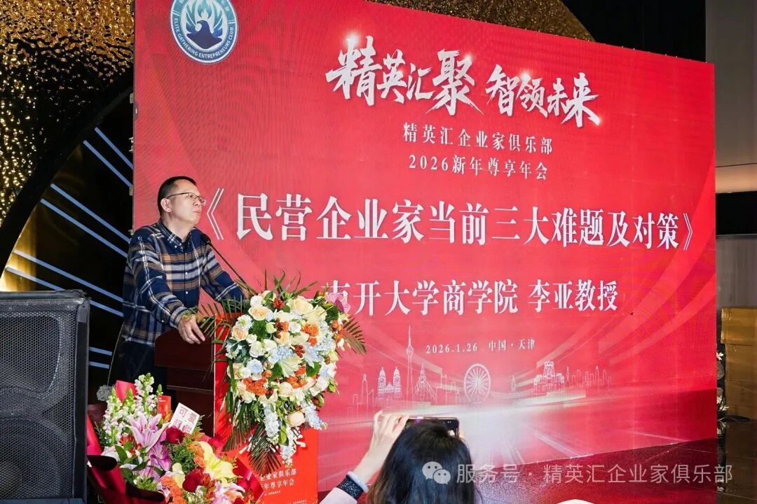 主题分享环节干货满满,为企业家们带来全方位智能力量。南开大学商学院李亚教授围绕《民营企业家当前三大难题及对策》展开深度解析,以专业的理论知识与丰富的实践经验,为企业家们破解发展困境提供宝贵思路;精英汇常务副会长、汉亚科技总经理张汉墩进行《精英汇数字化平台分享》,介绍平台在提升服务效率、促进资源对接等方面的功能与优势,让会员们对数字化转型充满期待;坚持星球天津城市负责人、精英汇商学院校长黄颖慧宣讲《演说家大会》,鼓励企业家们通过语言表达提升个人魅力与企业影响力;三人形思创始人胡思以《品牌定位与设计》为主题,深入浅出解析品牌建设核心逻辑;多友创盟五福门学院院长杨文利老师分享《五福文化》,从传统文化角度为企业发展与个人成长赋能;国学易经专家金会堂老师带来《2026年流年运势》分享,为企业家们新一年的发展提供传统文化视角的参考与指引。