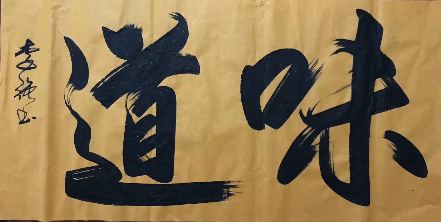 字藏乾坤,墨蕴哲思。“味”里藏春秋气象,笔底尽览岁月风华;“道”中蕴天地因缘,墨间尽显自然乾坤。李强先生以书法为媒,将文字的表层意涵与深层哲思完美融合,笔墨间既有熔古铸今的艺术造诣,又有洞察世事的人文底蕴,让简单二字生出万千意趣,于金笺之上勾勒出兼具视觉美感与精神内涵的书法佳作。身为非物质文化遗产榜书代表性传承人,他以笔为薪,将榜书艺术的精髓与东方哲思相融,其作品形神兼备,意境悠远,赏之不仅能感受翰墨书法的艺术之美,更能于笔墨间体悟“味道”二字背后的人生智慧与天地大道,尽显非遗榜书艺术的独特魅力与文化厚度。