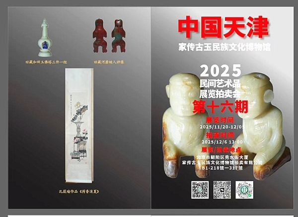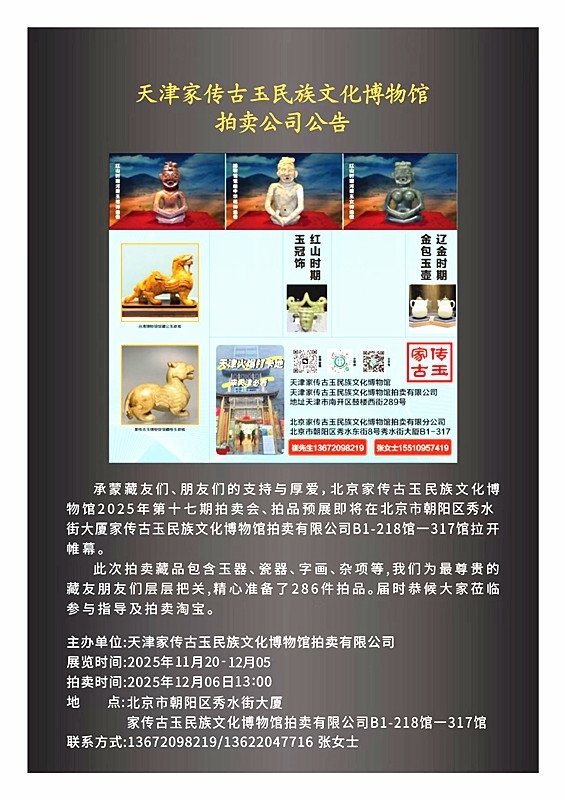营销环球网讯(李兆祥 报道) 11月17日,天津家传古玉民族文化博物馆拍卖有限公司近日宣布,将于2025年12月在北京举办一场盛大的民间艺术品拍卖会。预展活动定于11月20日至12月5日举行,正式拍卖会则安排在12月6日星期六下午1点开槌。活动地点位于北京市朝阳区秀水街大厦的家传古玉民族文化博物馆拍卖有限公司B1-218馆至317馆。此次拍卖会面向广大藏友和艺术爱好者开放,支持线上线下同步竞拍,预展期间还将提供交流鉴赏和洽谈服务。