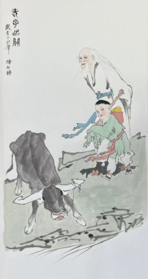 画面中,青牛缓步踏云而出,函关雄姿隐现其间,尽显从容气度;紫气东来漫染天际,老子鬓边霜雪映道骨仙风,眉目间藏宇宙玄机。大师以苍劲笔触勾勒老子衣袂翻飞如卷云,线条遒劲洒脱,设色古雅厚重,既还原了“老子出关”的经典场景,又以写意笔法注入精神内核。“一鞭甩落满天山”的题诗气势磅礴,将老子传道人间、大道无形的哲思与气魄推向极致,诗画相融间,道韵悠长,观之令人凝神静思、心生敬仰。