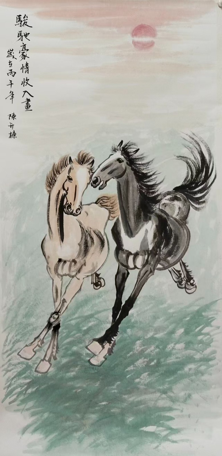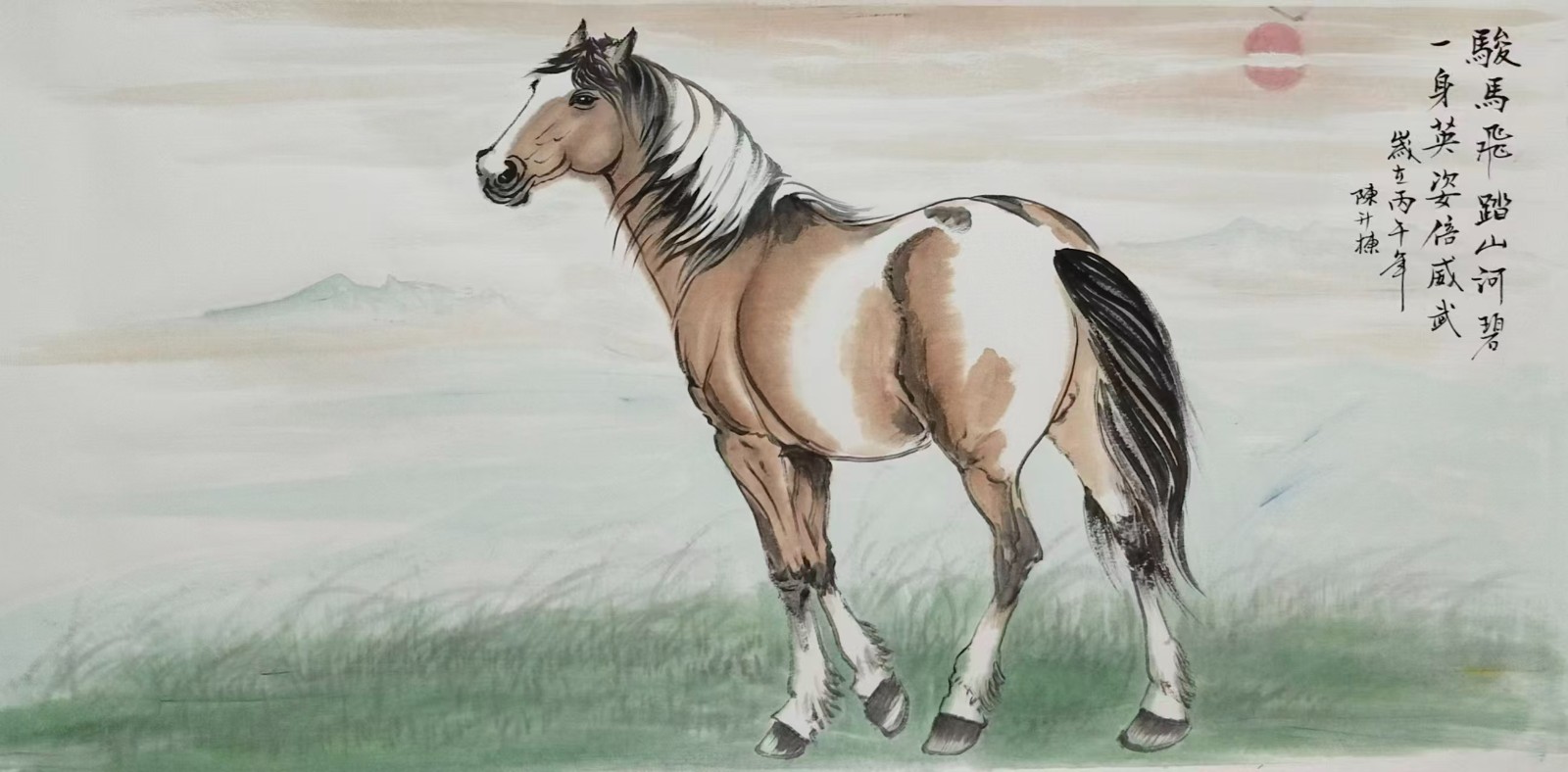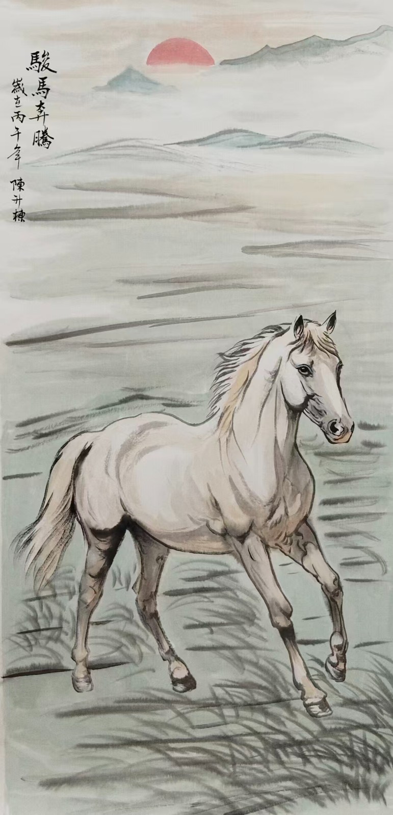 骏马自古象征着奋进、祥瑞与前程似锦,承载着自强不息、奋勇向前的精神内涵。陈升栋先生以情入画、以笔传神,将对生活的热忱与对理想的追求融入画作之中,让每一幅骏马图都兼具艺术美感与精神力量。作品既传承了中华传统画马的文脉精髓,又贴合当代审美,格调高雅、气韵生动,无论是厅堂陈设、办公装饰,还是收藏馈赠,皆寓意事业腾飞、锐意进取、前程似锦。