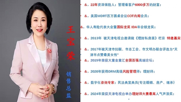 2017年,王宝荣被天津市妇联、市总工会、市文明办联合评为"天津点赞最美女性"。这个称号背后,是她服务超过千名客户、管理6000多万客户财富的专业成就,更是她"内心向善、合规经营"的职业操守。