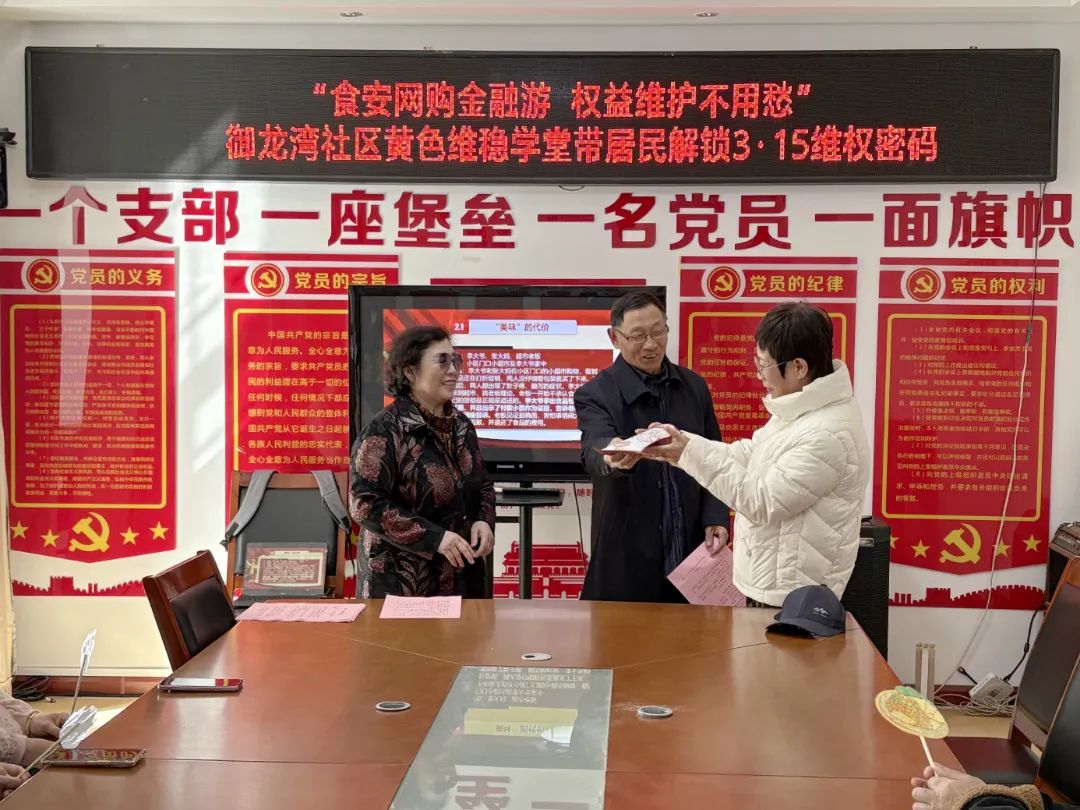 3月12日上午,御龙湾社区活动室内掌声与笑声此起彼伏。一场主题为“食安网购金融游 权益维护不用愁”的沉浸式普法活动正在开展。活动紧扣“共筑满意消费”主题,从居民日常网购、旅游、金融投资等消费场景入手,通过情景演绎,让维权知识浸润居民心田。