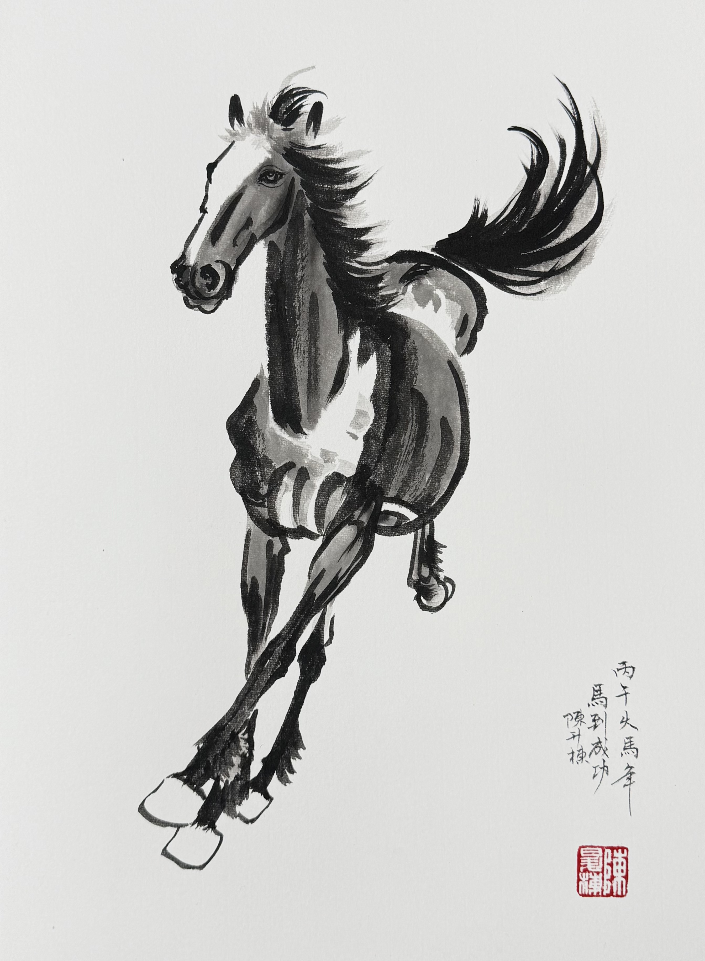2026年的这幅《马到成功图》,是陈升栋艺术生涯的又一里程碑。它以笔墨为桥,连接了百年经典与当下时代;以诗句为魂,赋予了奔马精神更丰富的内涵;以创新为翼,让传统国画突破了时空的界限。当我们凝视画面中那匹踏风而来的骏马,仿佛能听见跨越百年的艺术回响,感受到新时代的昂扬气息。这幅作品不仅是一次成功的临摹创作,更是一场传统文化的当代焕新,它证明了经典从未过时,只要有匠心的坚守与创新的勇气,中国水墨的魅力便能在岁月长河中不断奔涌,生生不息。