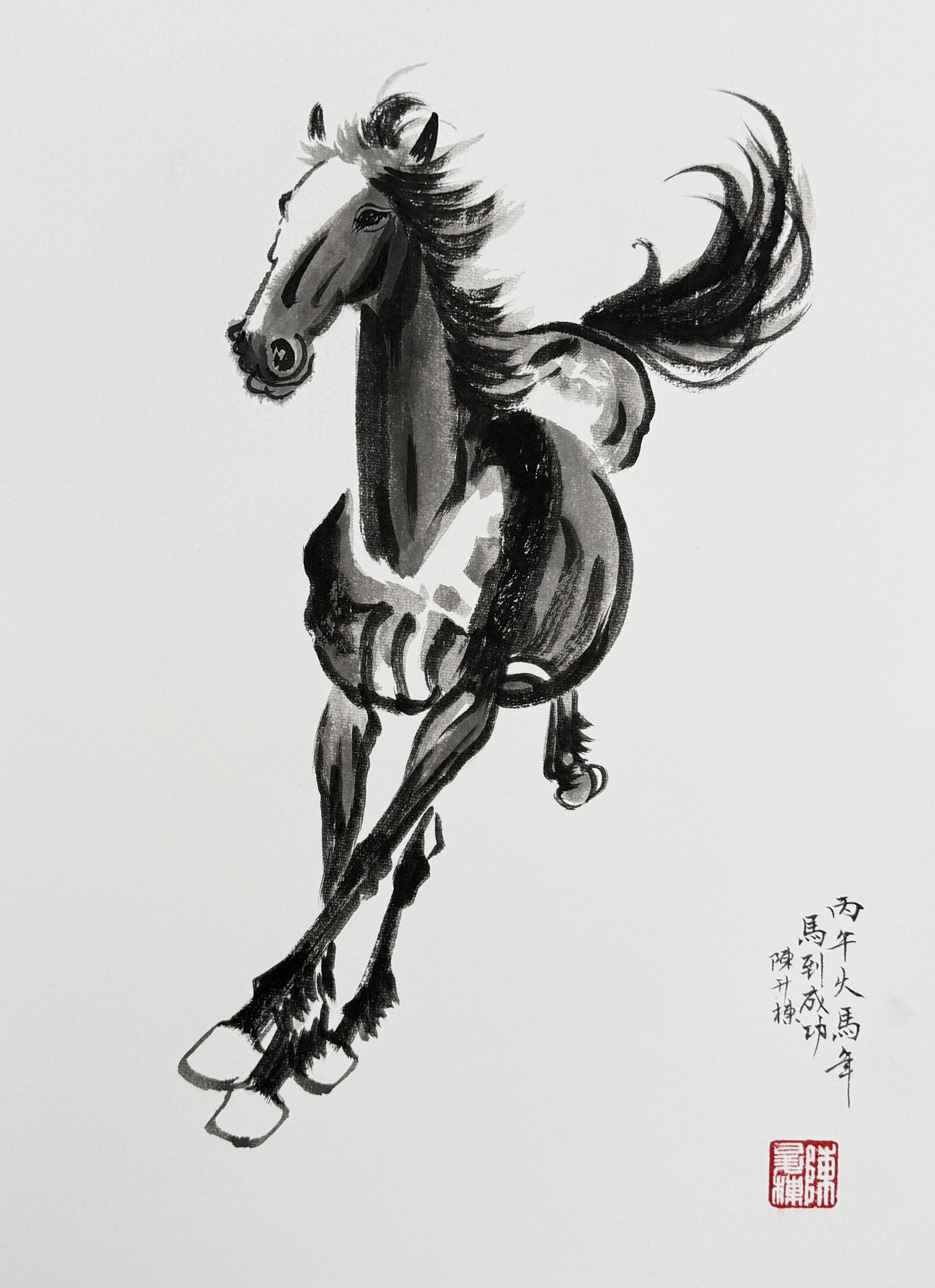 陈升栋的临摹,以敬畏之心还原经典,又融入了当代审美的鲜活气韵。他笔下的骏马,墨色如长虹般奔涌,鬃毛与蹄声裹挟着风雨之势席卷长空,完美呼应了诗中的磅礴意境。他以扎实的笔墨功底,精准捕捉骏马肌肉的张力与动态的韵律,让奔马的骁勇与不羁跃然纸上。在细节处,他巧用墨色的干湿浓淡,让骏马的立体感与层次更富张力,使作品既保有经典的厚重底蕴,又不失当代笔墨的灵动。