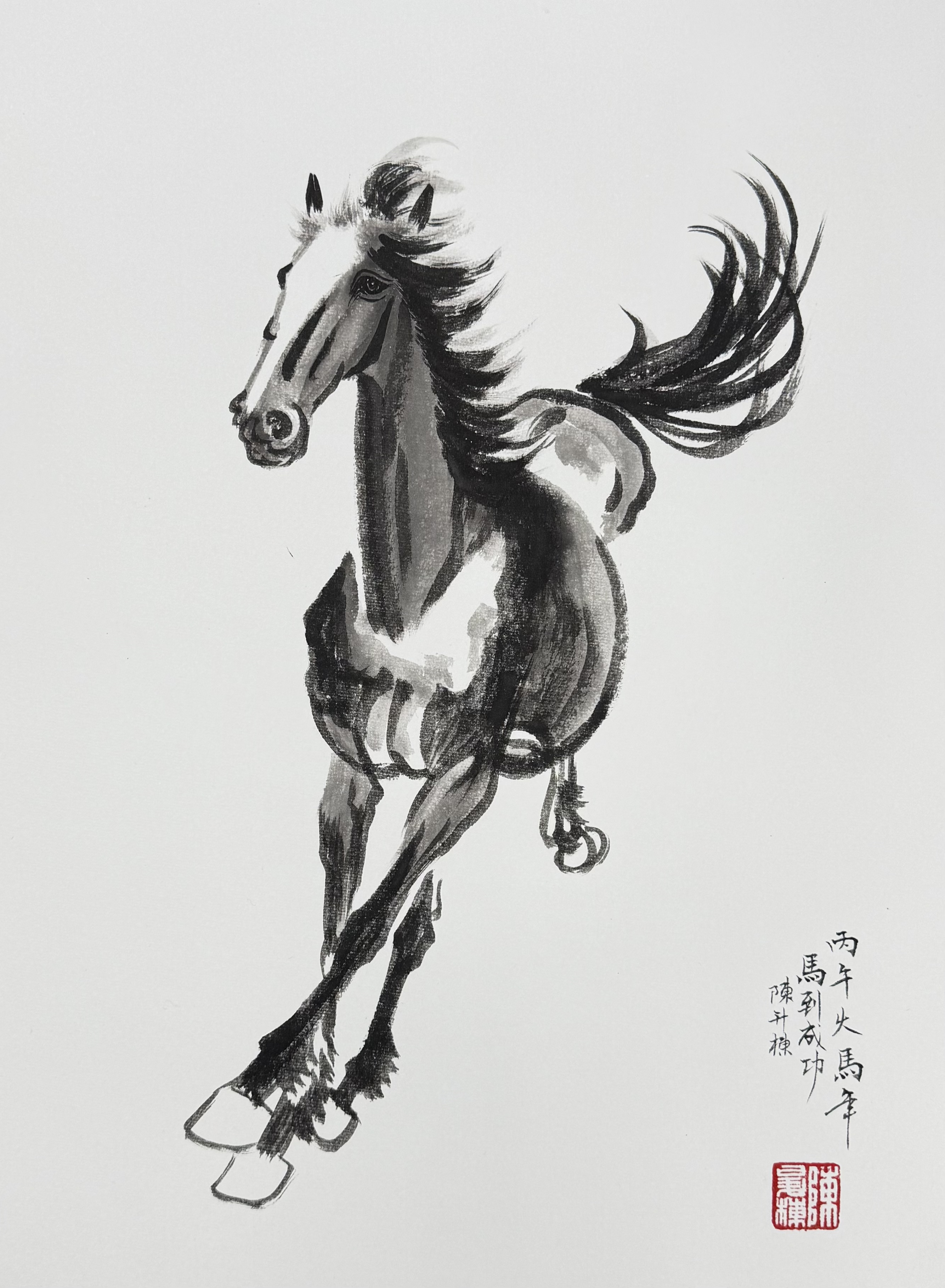 整幅画作笔力流畅,墨色鲜活,骏马神采飞扬,气势奔放,既有传统笔墨底蕴,又不失大气豪迈之感,将“马到成功”的吉祥意境表现得淋漓尽致。