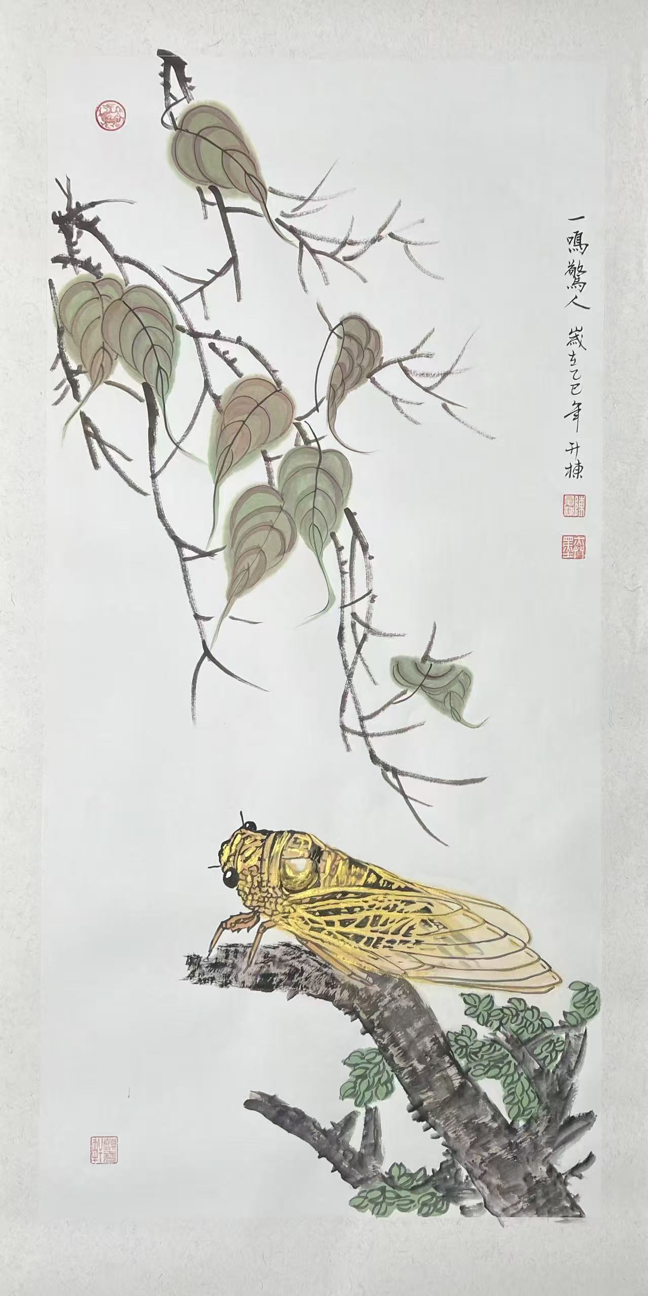陈升栋笔下的蝉,从敛翅眠秋到振羽惊尘,每一处细节都藏着对生命张力的精准捕捉:或见蝉翼凝着晨露微光,淡金勾染的翎羽与干墨皴擦的枝干相融,在“金翅凝光抱枝眠”的静态里,藏着“未鸣先蓄九秋天”的沉潜;或见蝉足攀附苍劲枝节,复眼泛着锐利亮泽,浓墨衬出的立体轮廓与半枯叶的清劲秋意,铺垫出“厚积薄发”的蓄势待发;亦有蝉翼舒展如流光,飞白笔意写尽振羽的动感,墨色扫拂的叶片似随羽风波动,让“一朝振羽声穿叶”的迸发之烈,在无声画面里生出穿透密林的鸣响;更有蝉立枝巅、翅敛声余,淡墨晕染的远山烟岚间,“惊破千山午梦烟”的余韵绵长,让“一鸣”的震撼不止于瞬间,更化作叩击心灵的长久回响。