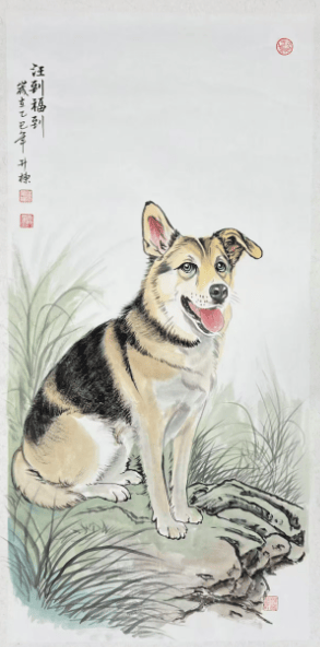 而“人间若问福何在,犬吠声中到眼前”,是作品的点睛之韵。他借灵犬“汪(旺)”的谐音,将“犬吠”与“福到”相联——没有刻意堆砌吉祥符号,仅以灵犬的鲜活神态与晴川的开阔意境,就让“福在日常”的温情自然流露。笔墨间既有国画的雅致,又将“旺福”的寓意揉进生活图景里,让观者见犬即见喜,于闲淡画面中触达祥瑞的温度。