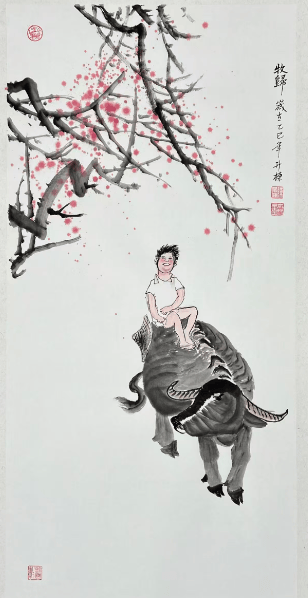 营销环球网讯 “牛背横吹短笛轻”,国家一级美术师陈升栋以灵动笔墨,在《牧归》中勾勒出悠然的乡野图景。画面里,牧童斜坐牛背,身姿随意舒展,手中短笛横置唇边,虽未显吹奏之态,却似有轻悠笛音溢出;老牛缓步前行,身形憨厚,皮毛以淡墨与赭石色晕染,纹理柔和,尽显温顺质感,牛背与牧童的组合,瞬间将“牧”的闲适氛围拉满。