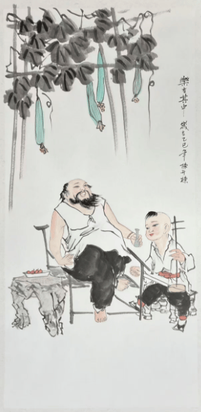画面中,丝瓜垂架影影绰绰,藤蔓交错间缀满生机;弦上清风徐徐流淌,似有丝竹雅韵入耳;一盏清茶袅袅飘香,涤尽浮世喧嚣;爷孙相视而笑,眉眼间满是温情,秋光漫染下,尽是岁月静好的天伦之乐。大师以灵动笔墨勾勒景物情态,墨色清雅温润,设色明快自然,每一处细节都栩栩如生,将田园生活的闲适与亲情的暖融展现得淋漓尽致。“爷孙笑里有秋诗”的题诗点睛,诗画相融,气韵天成,尽显对生活本真的热爱与感悟!