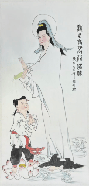 画面中,莲台承足,水纹轻漾,尽显圣洁庄严;玉净瓶中,甘露盈盈,滋养世间万物;童子虔心合掌,眉目含敬,满溢至诚之念。大师以细腻笔触勾勒菩萨慈眉善目,衣袂飘飘如沐清风,线条流畅如行云流水,设色温润典雅,既不失传统佛画的肃穆庄重,又融入现代艺术的审美意蕴。“慈光已渡万千程”的题诗点睛,将菩萨普度众生的悲悯情怀与无边法力展现得淋漓尽致,诗画交融间,禅意盎然,观之令人心生敬畏、杂念皆消。