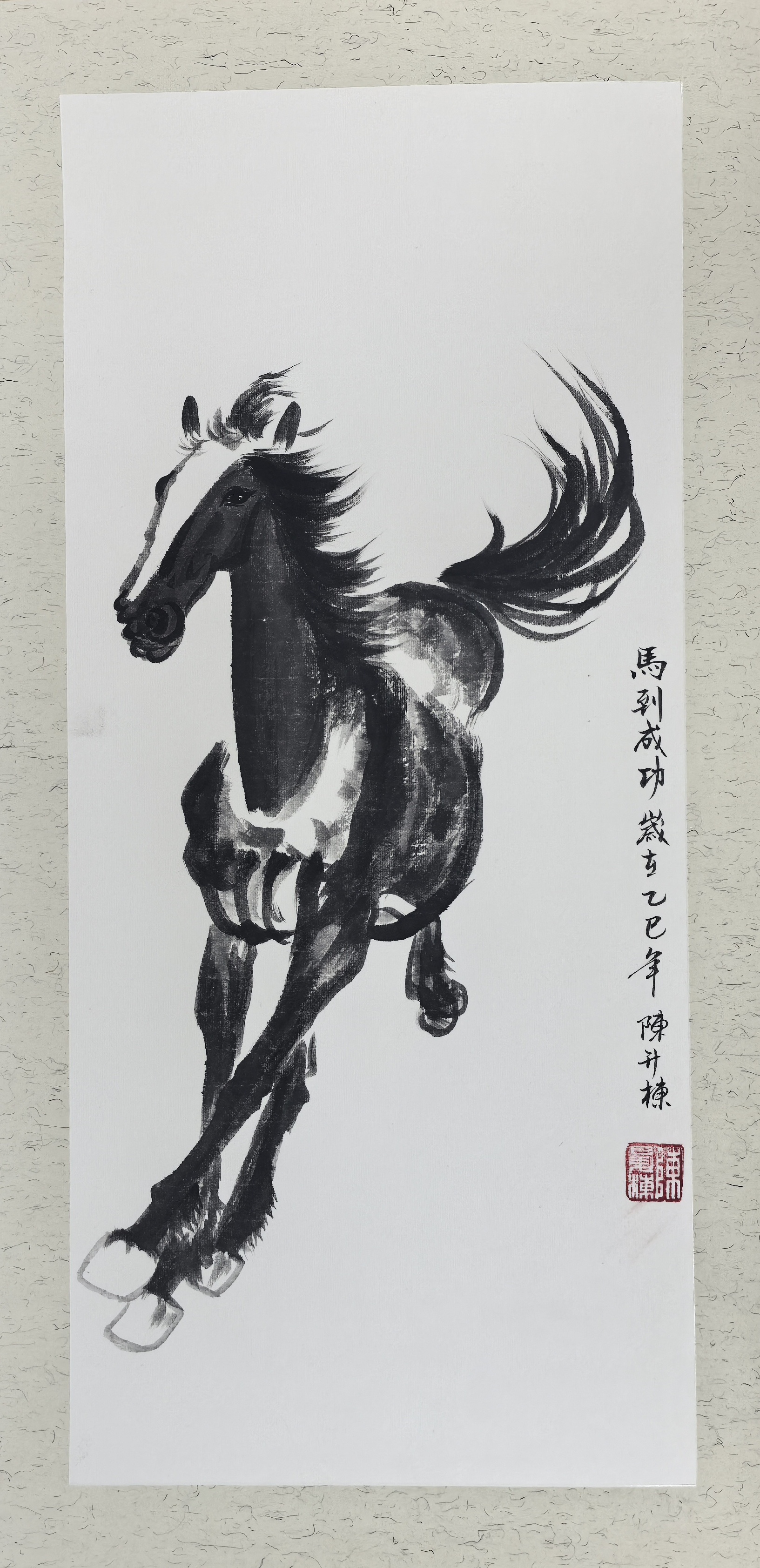 这幅《马到成功》以宣纸为媒,水墨为魂,开篇便见“墨鬣飞旋破纸出”的磅礴气势。陈升栋深谙徐悲鸿“以形写神”的笔墨精髓,运笔如疾风骤雨,中锋勾勒马之筋骨,侧锋晕染鬣之飘逸,浓墨重彩处彰显力量,淡墨留白间暗藏灵动。骏马昂首扬蹄,鬃毛翻飞,仿佛挣脱纸面束缚,裹挟着千钧之势奔涌而来,每一笔线条都饱含张力,每一处墨色都凝聚神韵,将奔马的矫健身姿与昂扬气势刻画得入木三分。