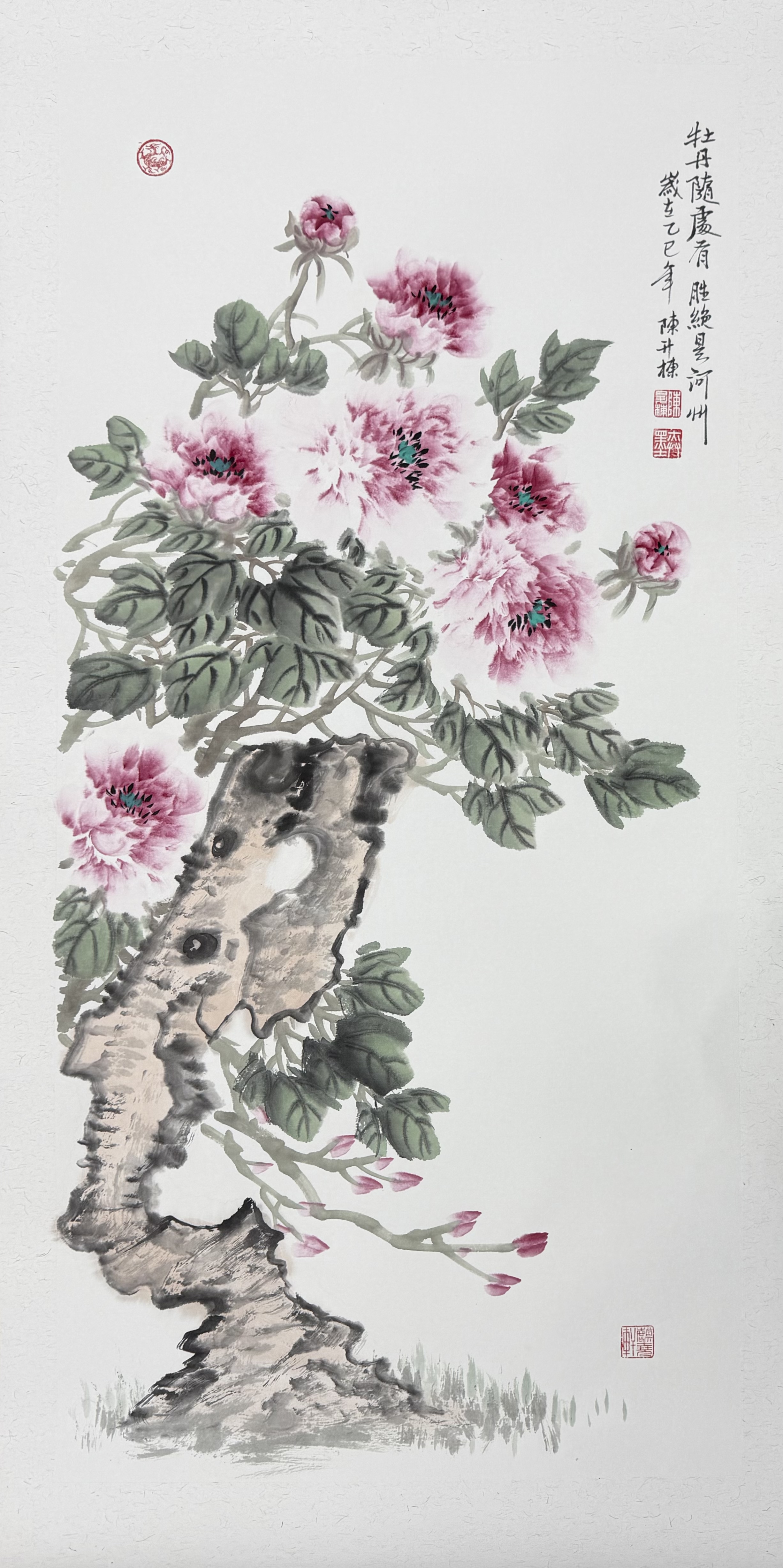 “瘦石崚嶒抱粉霞,枝间香影落谁家。东风不解藏春色,吹绽胭脂十万花。” 国家一级美术师、中国(香港)美术家协会副主席陈升栋先生,以这首大气磅礴的题画诗为引,创作出2026年牡丹题材又一扛鼎之作《牡丹》。这幅作品以瘦石为骨、牡丹为魂,在尺幅之间铺展万千春色,与此前《牡丹图》《紫牡丹》《石畔牡丹》《蝶戏牡丹》共同构建起先生牡丹艺术的恢弘版图,为即将于2026年落成的专属牡丹厅再添浓墨重彩的一笔,尽显当代国画大家的深厚造诣与非凡气度。