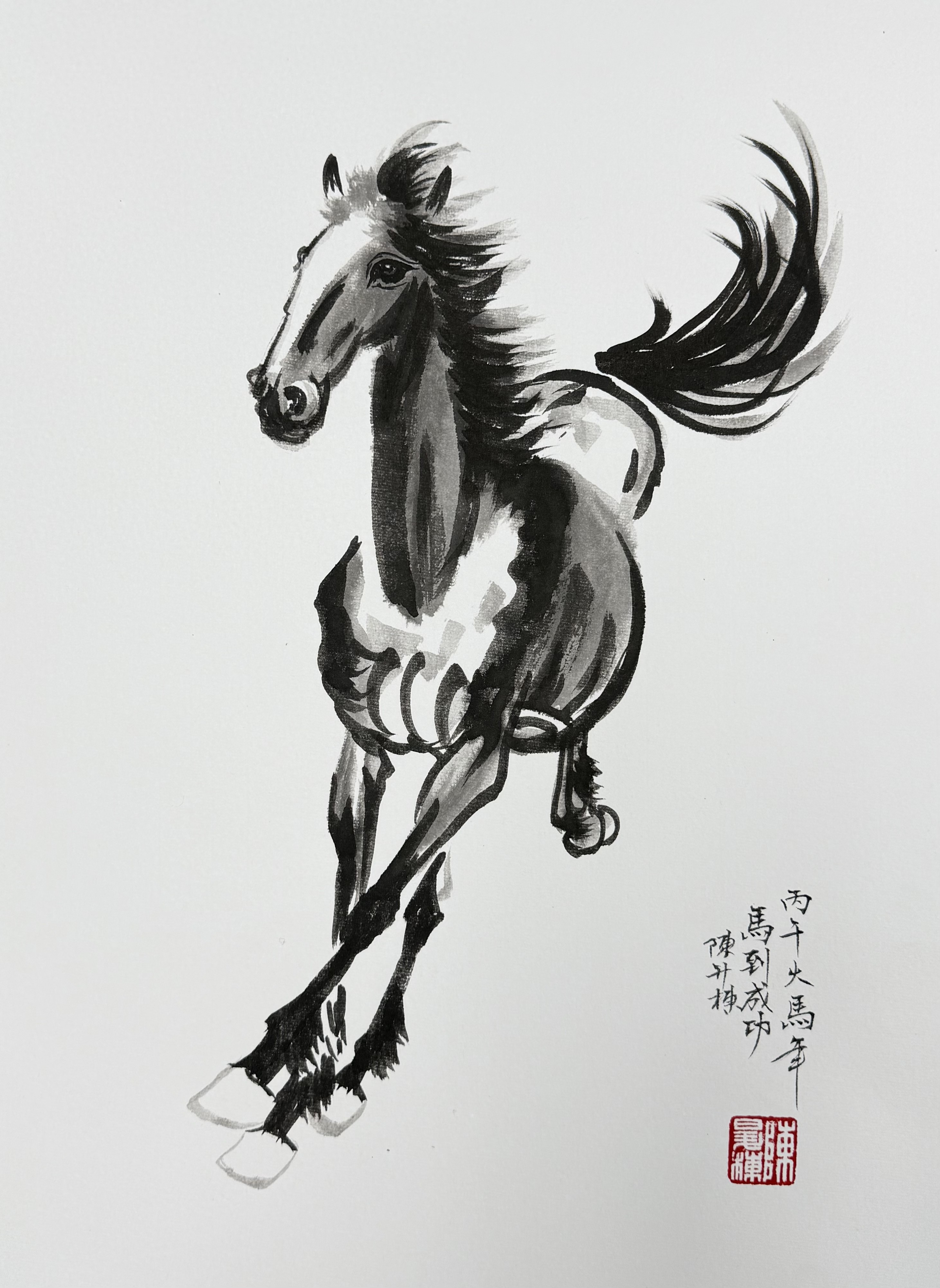 国家一级美术师陈升栋先生,浸淫国画艺术数十载,精研徐悲鸿大师画马之精髓,融经典风骨于个人匠心,潜心摹绘臻品《马到成功图》。作品以笔立骨、以墨蕴神,落笔刚劲洒脱,墨韵浓淡相彰,将骏马奔腾的豪迈之姿勾勒得形神兼备:墨色翻卷似惊雷乍响,鬃毛舒扬若流云漫展,健蹄腾跃迸发浩然正气,破开俗世烟尘一往无前;骏马傲骨铮铮、骁志凌云,不屑囿于人间厩栏,一心踏月凌云、驰骋苍冥,尽展志存高远的胸襟与一往无前的磅礴气魄。