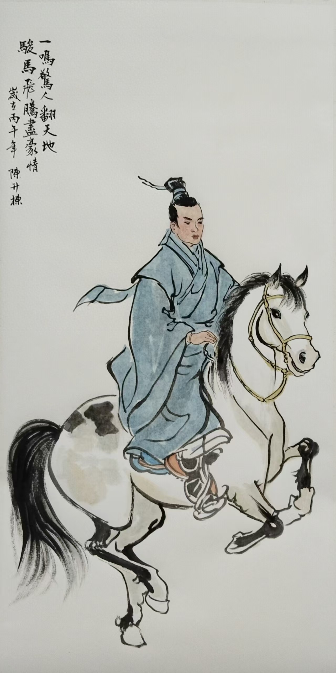 画中人物身姿挺拔,衣袂随风轻扬,神态从容洒脱;骏马体态健朗、精神昂扬,人马之间呼应自然、动静相宜。画家以细腻而洒脱的笔触,将古典骑射场景的洒脱气度与山水意境融为一体,既保留了传统国画的笔墨韵味,又赋予画面鲜活的艺术气息。
