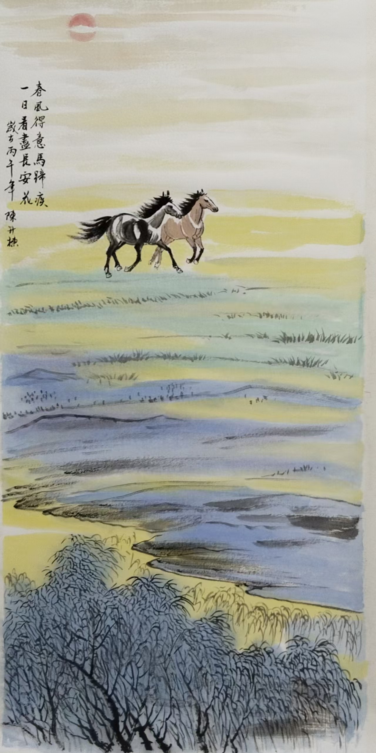 陈升栋先生为这幅作品题诗“春风得意踏云行,双骏齐驱趁日明。莫道长安花事远,眼前千里是芳程”,短短四句绝句,与作品内核浑然一体,字字凝练豪迈,句句意蕴深远。诗句以春日清风、旭日晨光为底色,勾勒出双骏并肩驰骋、意气风发之态,既绘出骏马踏云而行的灵动洒脱,更暗含同心共进、乘势而上的奋进精神,而后两句一扫前路遥远的慨叹,传递出前程似锦、繁花满途的笃定与豁达,将美好期许与人生壮志尽数融入其中。