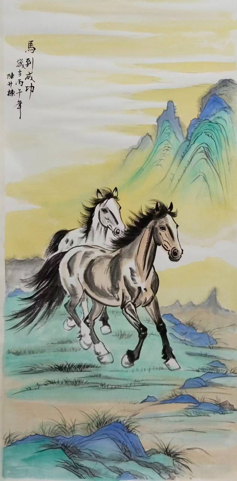 数十载的艺术沉淀,让陈升栋先生的笔墨愈发老辣成熟,《马到成功》系列作品,是他艺术功底的集中展现,更是他对传统鞍马画传承与创新的生动诠释。他坚守国画本源,不追浮华之风,专注于笔墨与神韵的打磨,让笔下的骏马既有古画中鞍马的典雅风骨,又有新时代的昂扬朝气,每一幅作品都凝聚着他对艺术的执着,对美好的向往。