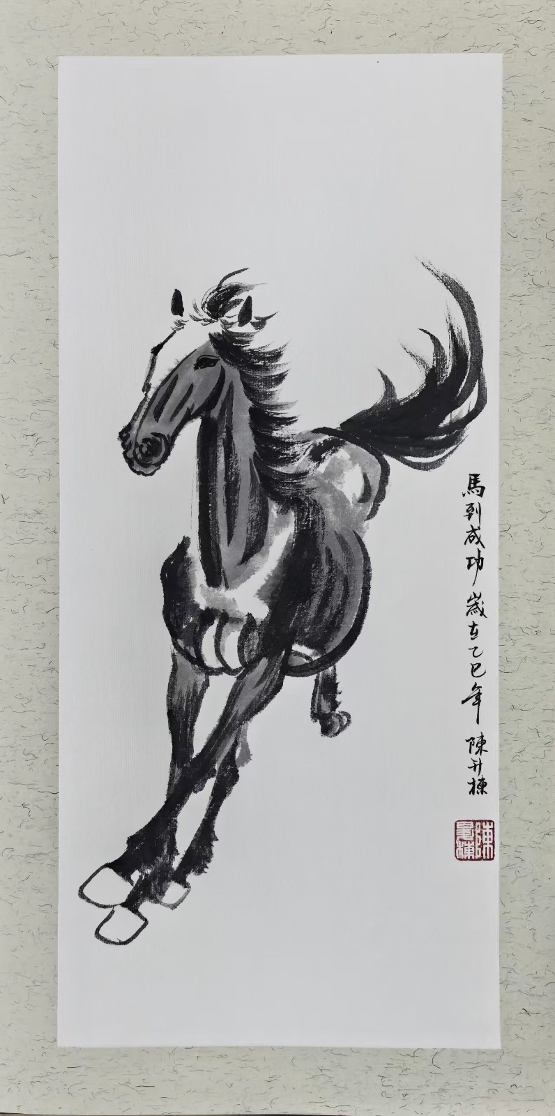 陈升栋先生深耕书画艺术数十载,对鞍马题材的创作有着极深的造诣与独到的理解,《马到成功》系列是其艺术创作中的经典篇章,更是他倾注心血、凝练匠心的诚意之作。该系列作品摒弃繁复雕琢,以极简而老道的笔墨,勾勒出骏马最具精气神的姿态,每一幅作品都形神兼备,气韵贯通,将“马到成功”的美好寓意融入笔墨肌理,让画作既有艺术鉴赏性,更饱含真挚的吉祥祝福。