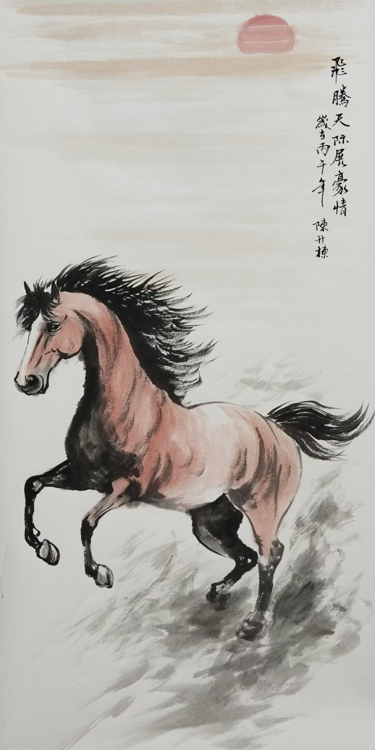 整幅作品以传统国画笔墨为根基,融时代精神于其中,既有写意之洒脱,又有写实之精妙,一笔一画皆见匠心,一景一境尽是情怀。陈升栋先生以笔为骨、以墨为韵,将骏马的精气神与天地的壮阔融为一体,不仅是对自然生灵的生动写照,更是对拼搏进取、自强不息精神的艺术诠释。